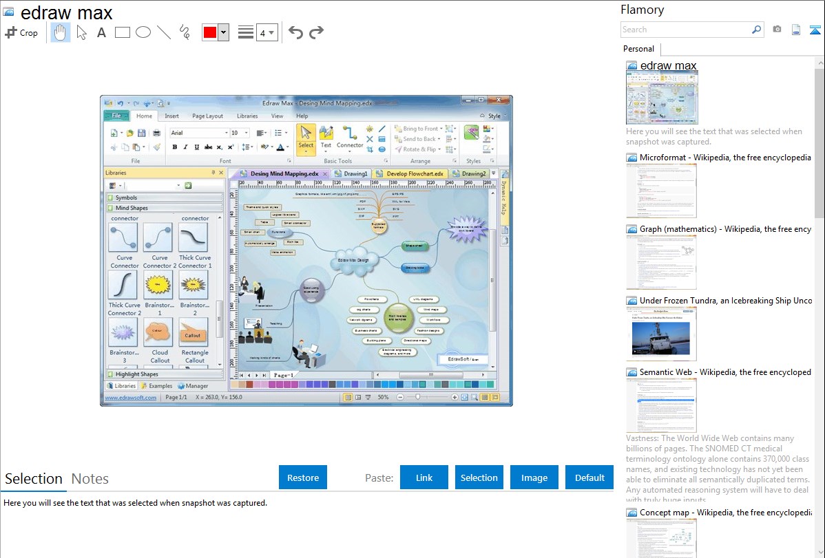 Flamory helps you capture and store screenshots from edraw max by pressing a single hotkey. It will be saved to a history, so you can continue doing your tasks without interruptions. Later, you can edit the screenshot: crop, resize, add labels and highlights. After that, you can paste the screenshot into any other document or e-mail message.