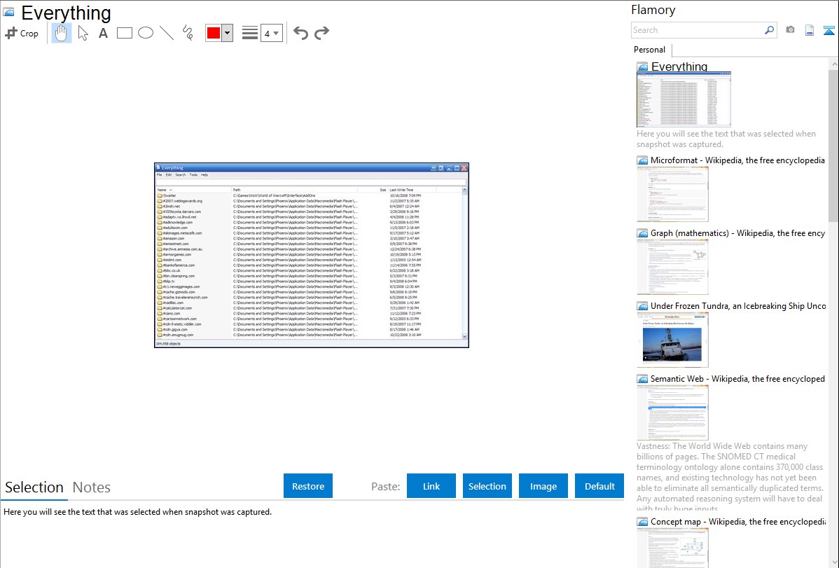 Flamory helps you capture and store screenshots from Everything by pressing a single hotkey. It will be saved to a history, so you can continue doing your tasks without interruptions. Later, you can edit the screenshot: crop, resize, add labels and highlights. After that, you can paste the screenshot into any other document or e-mail message.