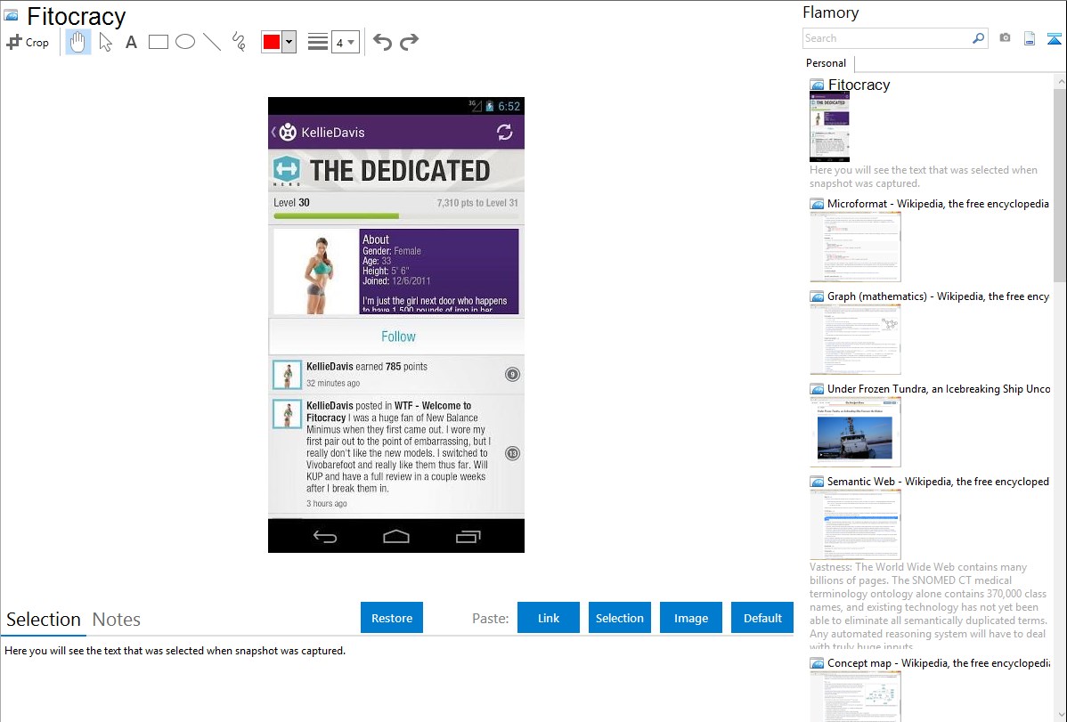 Flamory helps you capture and store screenshots from Fitocracy by pressing a single hotkey. It will be saved to a history, so you can continue doing your tasks without interruptions. Later, you can edit the screenshot: crop, resize, add labels and highlights. After that, you can paste the screenshot into any other document or e-mail message.