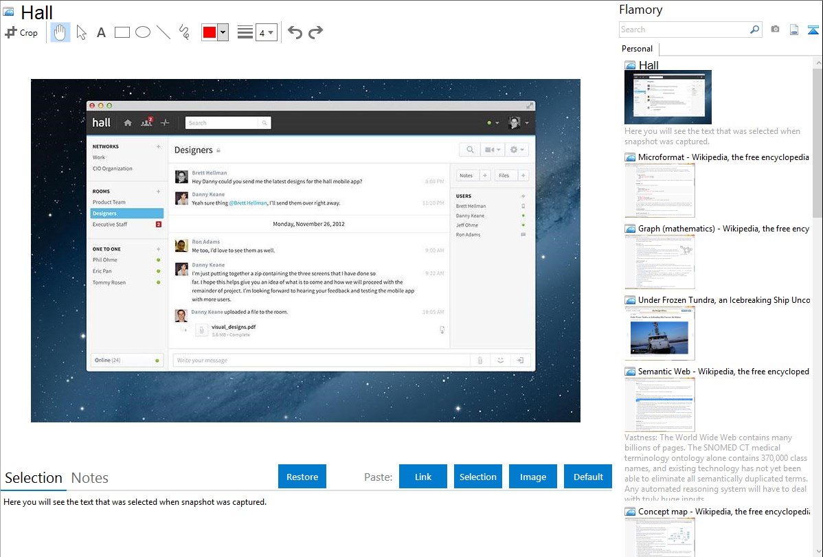 Flamory helps you capture and store screenshots from Hall by pressing a single hotkey. It will be saved to a history, so you can continue doing your tasks without interruptions. Later, you can edit the screenshot: crop, resize, add labels and highlights. After that, you can paste the screenshot into any other document or e-mail message.