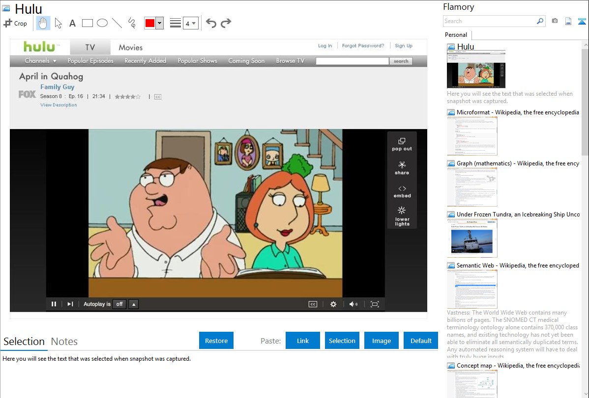 Flamory helps you capture and store screenshots from Hulu by pressing a single hotkey. It will be saved to a history, so you can continue doing your tasks without interruptions. Later, you can edit the screenshot: crop, resize, add labels and highlights. After that, you can paste the screenshot into any other document or e-mail message.
