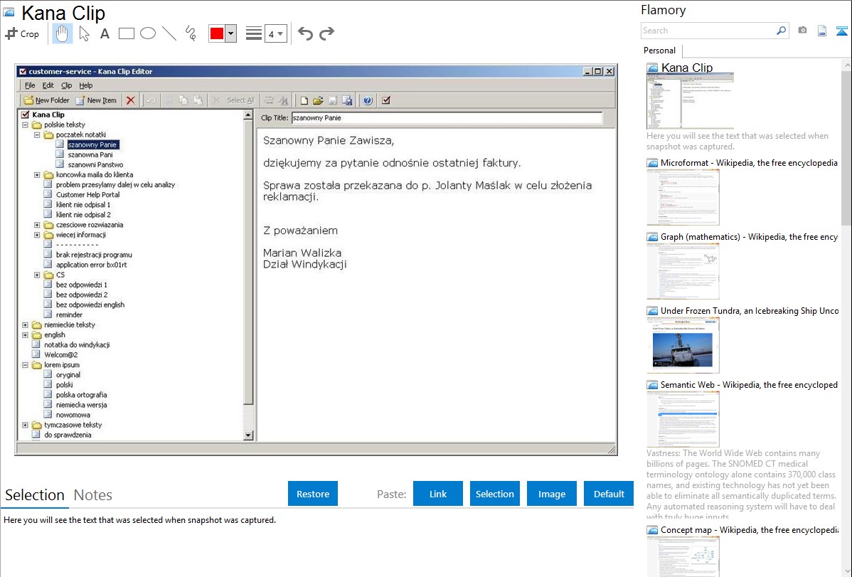 Flamory helps you capture and store screenshots from Kana Clip by pressing a single hotkey. It will be saved to a history, so you can continue doing your tasks without interruptions. Later, you can edit the screenshot: crop, resize, add labels and highlights. After that, you can paste the screenshot into any other document or e-mail message.