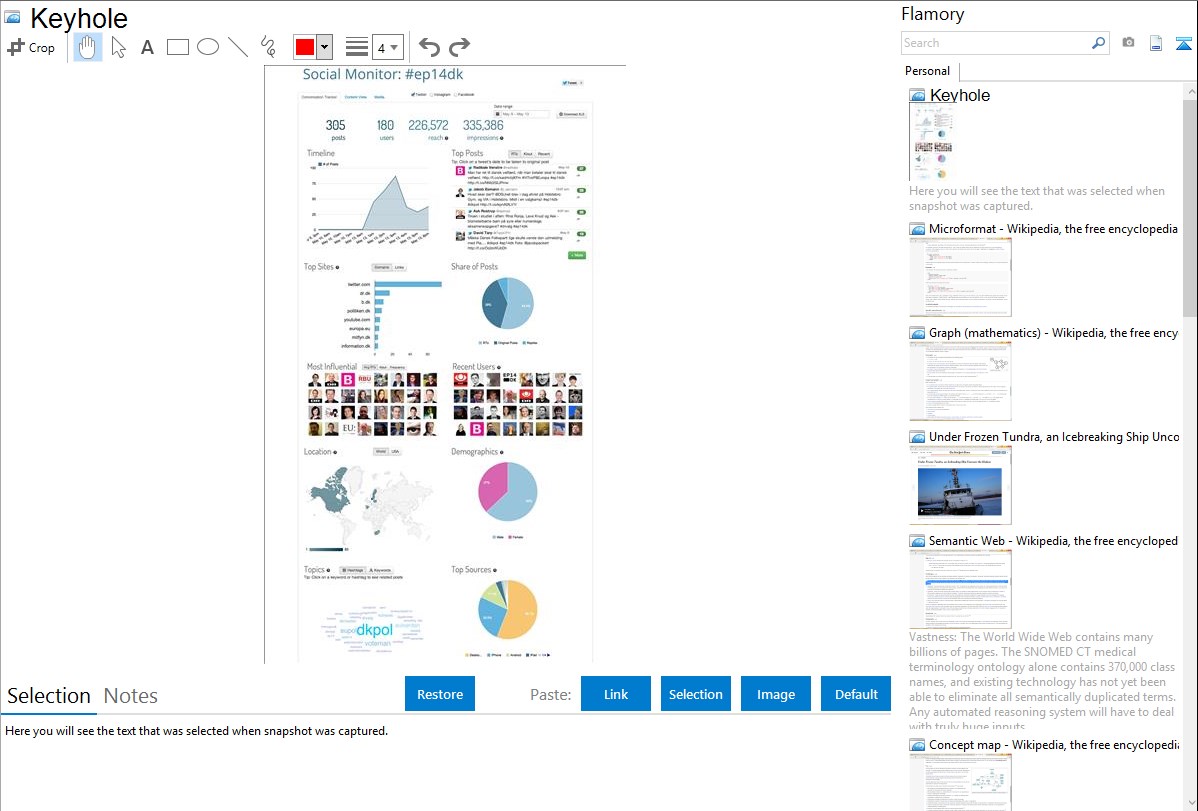 Flamory helps you capture and store screenshots from Keyhole by pressing a single hotkey. It will be saved to a history, so you can continue doing your tasks without interruptions. Later, you can edit the screenshot: crop, resize, add labels and highlights. After that, you can paste the screenshot into any other document or e-mail message.