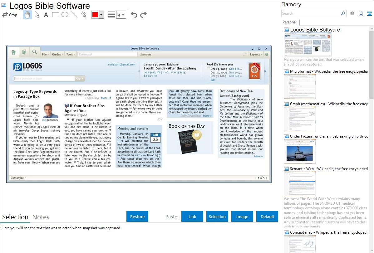 Flamory helps you capture and store screenshots from Logos Bible Software by pressing a single hotkey. It will be saved to a history, so you can continue doing your tasks without interruptions. Later, you can edit the screenshot: crop, resize, add labels and highlights. After that, you can paste the screenshot into any other document or e-mail message.