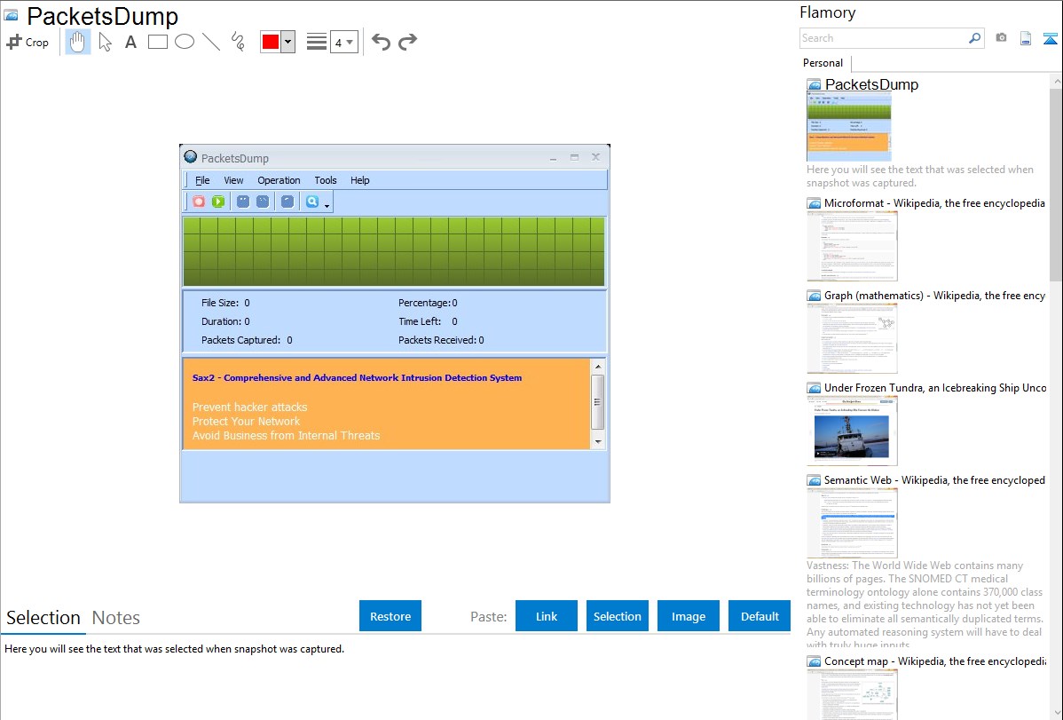 Flamory helps you capture and store screenshots from PacketsDump by pressing a single hotkey. It will be saved to a history, so you can continue doing your tasks without interruptions. Later, you can edit the screenshot: crop, resize, add labels and highlights. After that, you can paste the screenshot into any other document or e-mail message.