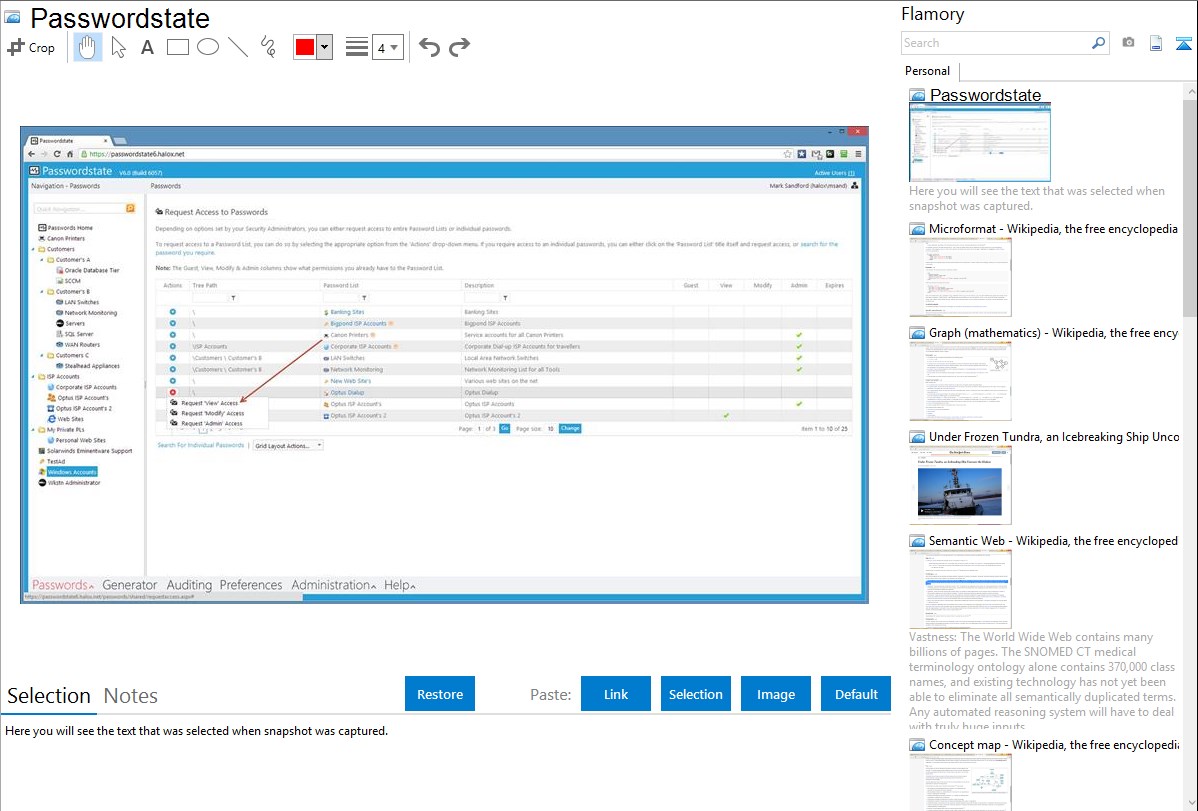 Flamory helps you capture and store screenshots from Passwordstate by pressing a single hotkey. It will be saved to a history, so you can continue doing your tasks without interruptions. Later, you can edit the screenshot: crop, resize, add labels and highlights. After that, you can paste the screenshot into any other document or e-mail message.