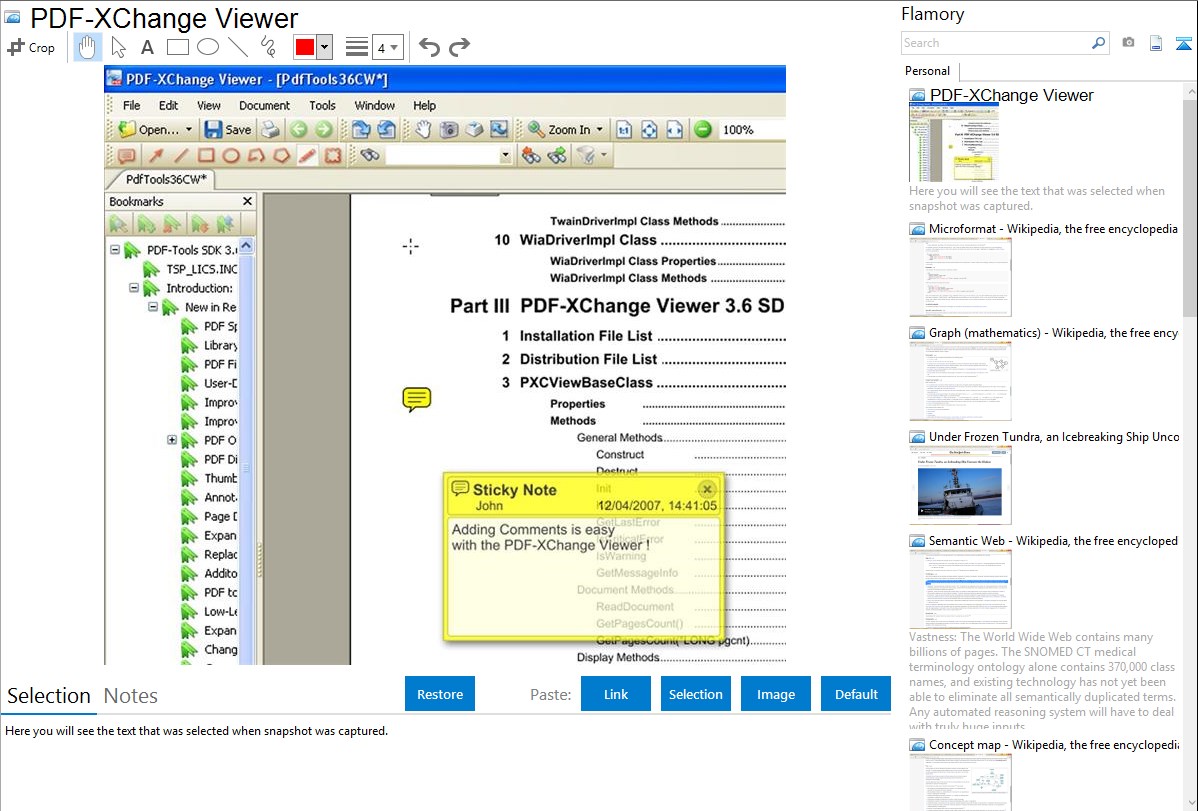 Flamory helps you capture and store screenshots from PDF-XChange Viewer by pressing a single hotkey. It will be saved to a history, so you can continue doing your tasks without interruptions. Later, you can edit the screenshot: crop, resize, add labels and highlights. After that, you can paste the screenshot into any other document or e-mail message.