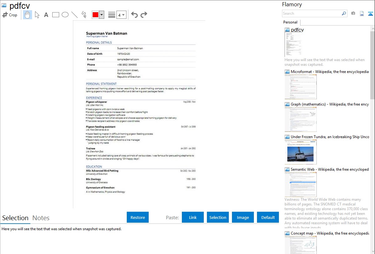 Flamory helps you capture and store screenshots from pdfcv by pressing a single hotkey. It will be saved to a history, so you can continue doing your tasks without interruptions. Later, you can edit the screenshot: crop, resize, add labels and highlights. After that, you can paste the screenshot into any other document or e-mail message.