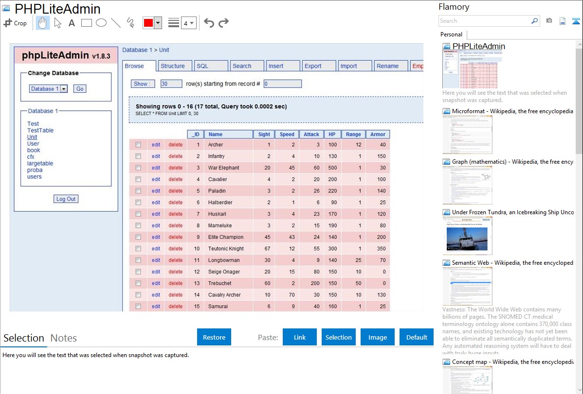 Flamory provides advanced bookmarking for PHPLiteAdmin. It captures screen, selection, text on the page and other context. You can find this bookmark later using search by page content or looking through thumbnail list.