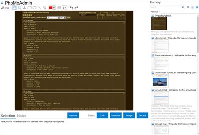 Flamory helps you capture and store screenshots from PhpMoAdmin by pressing a single hotkey. It will be saved to a history, so you can continue doing your tasks without interruptions. Later, you can edit the screenshot: crop, resize, add labels and highlights. After that, you can paste the screenshot into any other document or e-mail message.