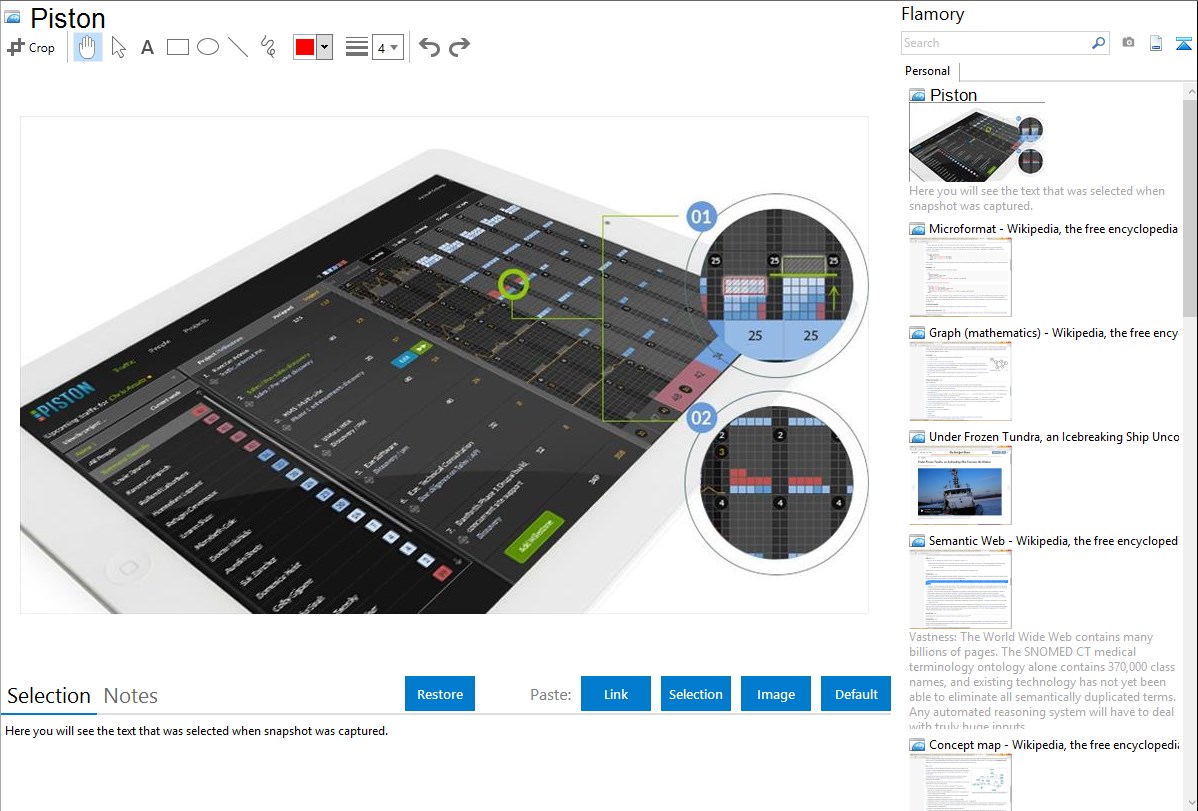 Flamory helps you capture and store screenshots from Piston by pressing a single hotkey. It will be saved to a history, so you can continue doing your tasks without interruptions. Later, you can edit the screenshot: crop, resize, add labels and highlights. After that, you can paste the screenshot into any other document or e-mail message.