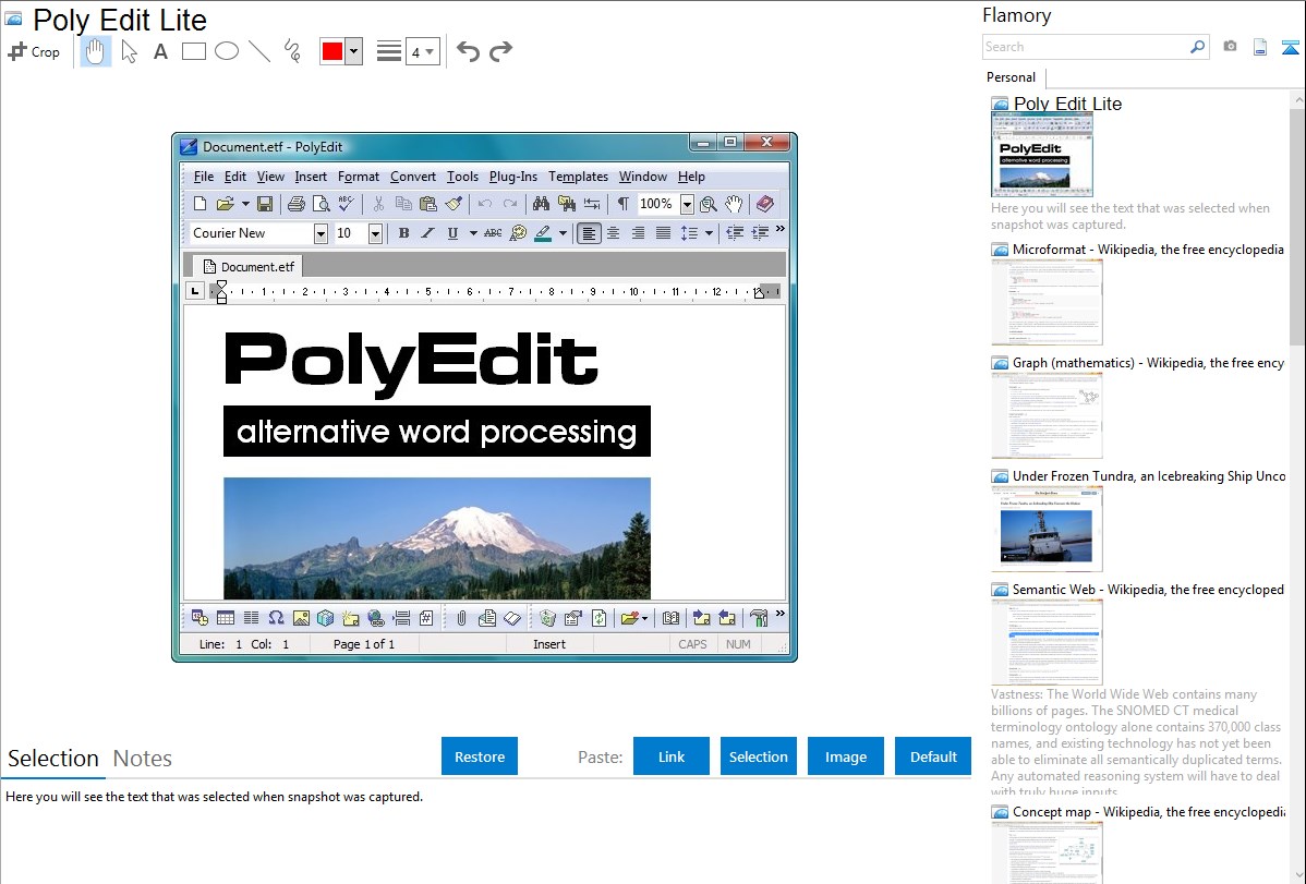 Flamory provides advanced bookmarking for Poly Edit Lite. It captures screen, selection, text of the document and other context. You can find this bookmark later using search by document content or looking through thumbnail list.