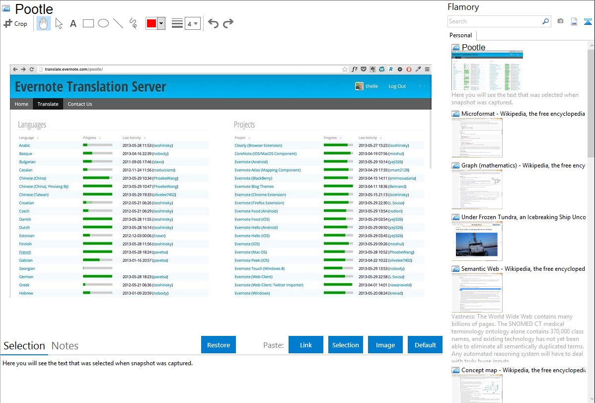 Flamory helps you capture and store screenshots from Pootle by pressing a single hotkey. It will be saved to a history, so you can continue doing your tasks without interruptions. Later, you can edit the screenshot: crop, resize, add labels and highlights. After that, you can paste the screenshot into any other document or e-mail message.