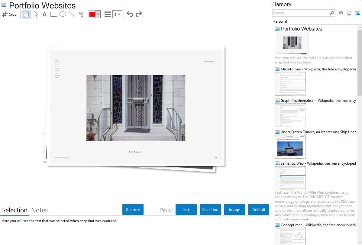 Flamory helps you capture and store screenshots from Portfolio Websites by pressing a single hotkey. It will be saved to a history, so you can continue doing your tasks without interruptions. Later, you can edit the screenshot: crop, resize, add labels and highlights. After that, you can paste the screenshot into any other document or e-mail message.