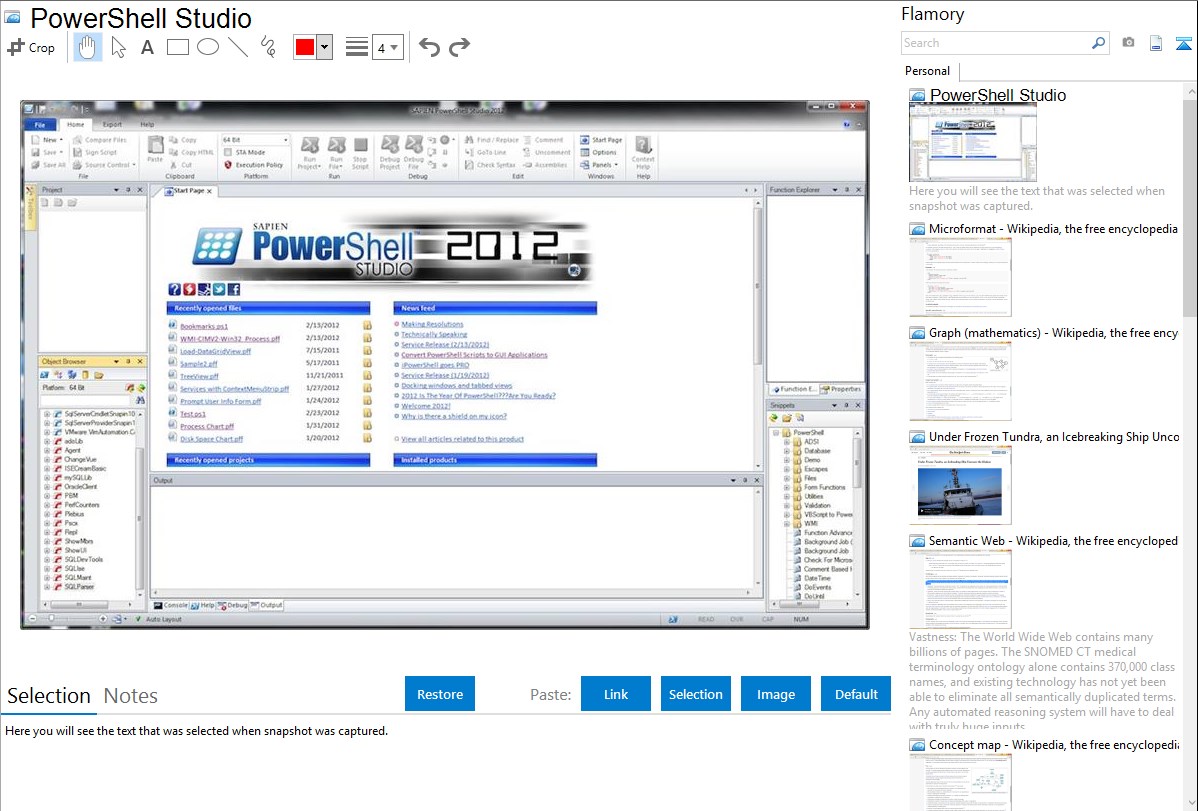 Flamory helps you capture and store screenshots from PowerShell Studio by pressing a single hotkey. It will be saved to a history, so you can continue doing your tasks without interruptions. Later, you can edit the screenshot: crop, resize, add labels and highlights. After that, you can paste the screenshot into any other document or e-mail message.