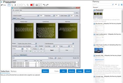 Flamory helps you capture and store screenshots from Praisenter by pressing a single hotkey. It will be saved to a history, so you can continue doing your tasks without interruptions. Later, you can edit the screenshot: crop, resize, add labels and highlights. After that, you can paste the screenshot into any other document or e-mail message.