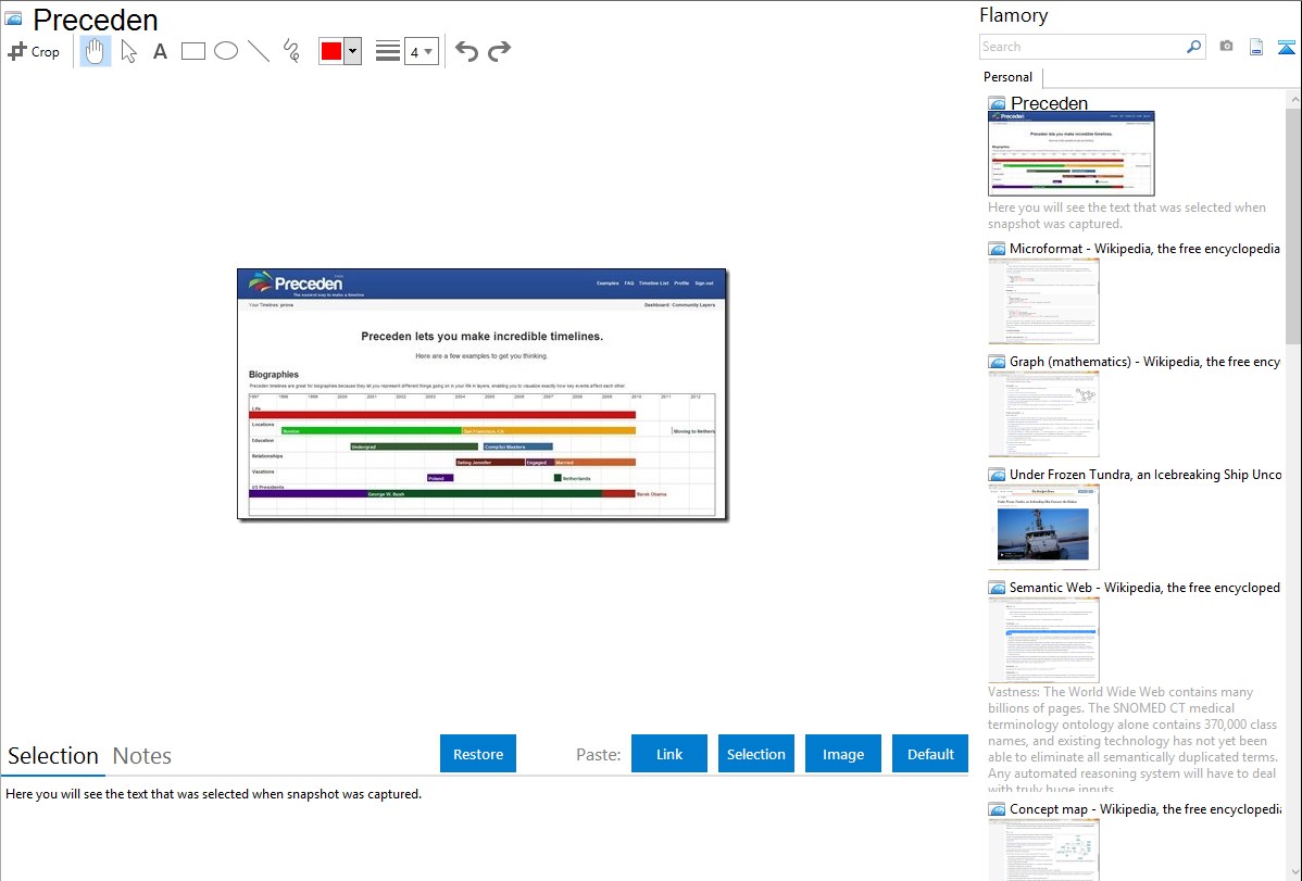 Flamory helps you capture and store screenshots from Preceden by pressing a single hotkey. It will be saved to a history, so you can continue doing your tasks without interruptions. Later, you can edit the screenshot: crop, resize, add labels and highlights. After that, you can paste the screenshot into any other document or e-mail message.