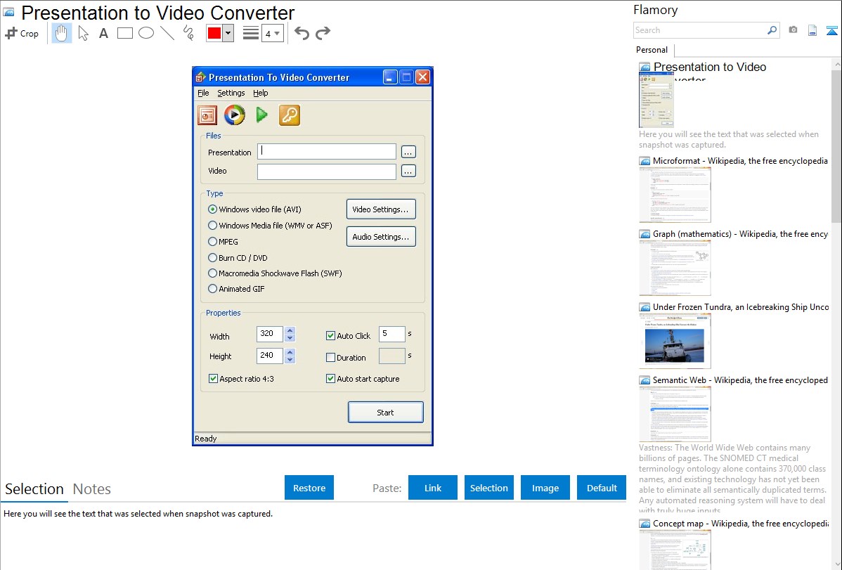 Flamory helps you capture and store screenshots from Presentation to Video Converter by pressing a single hotkey. It will be saved to a history, so you can continue doing your tasks without interruptions. Later, you can edit the screenshot: crop, resize, add labels and highlights. After that, you can paste the screenshot into any other document or e-mail message.