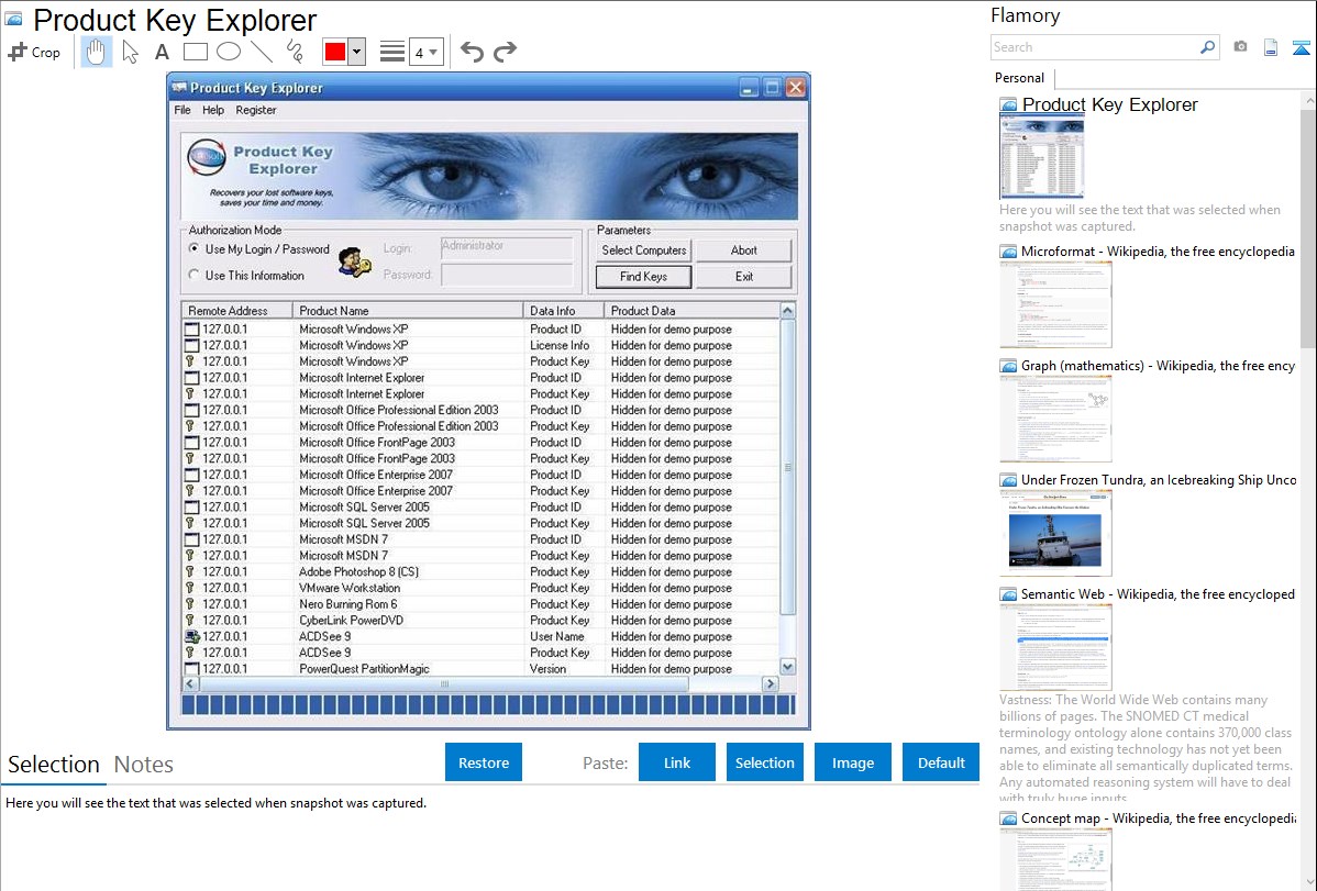 Flamory helps you capture and store screenshots from Product Key Explorer by pressing a single hotkey. It will be saved to a history, so you can continue doing your tasks without interruptions. Later, you can edit the screenshot: crop, resize, add labels and highlights. After that, you can paste the screenshot into any other document or e-mail message.