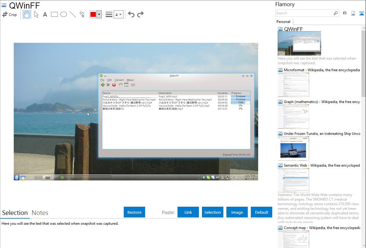 Flamory helps you capture and store screenshots from QWinFF by pressing a single hotkey. It will be saved to a history, so you can continue doing your tasks without interruptions. Later, you can edit the screenshot: crop, resize, add labels and highlights. After that, you can paste the screenshot into any other document or e-mail message.