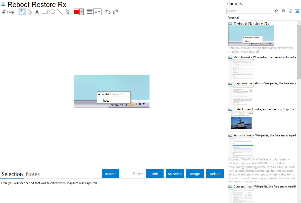 Flamory helps you capture and store screenshots from Reboot Restore Rx by pressing a single hotkey. It will be saved to a history, so you can continue doing your tasks without interruptions. Later, you can edit the screenshot: crop, resize, add labels and highlights. After that, you can paste the screenshot into any other document or e-mail message.