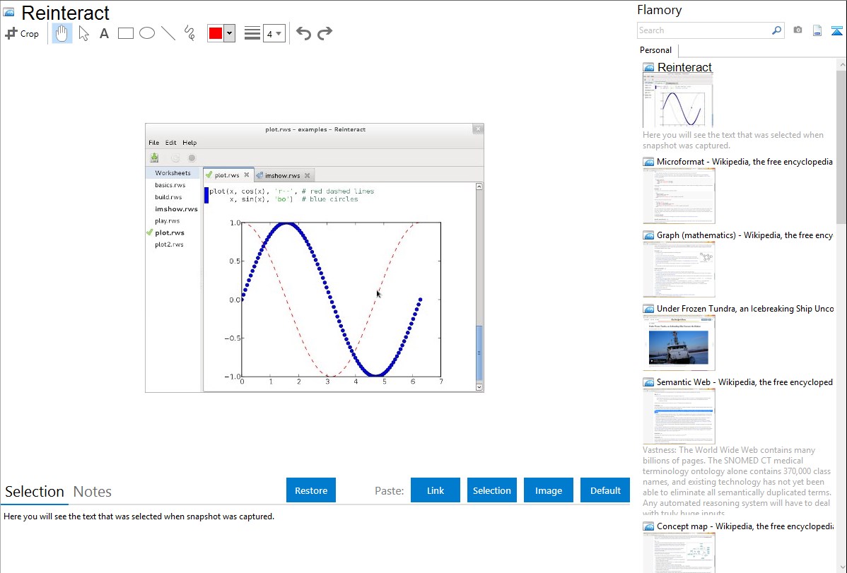 Flamory helps you capture and store screenshots from Reinteract by pressing a single hotkey. It will be saved to a history, so you can continue doing your tasks without interruptions. Later, you can edit the screenshot: crop, resize, add labels and highlights. After that, you can paste the screenshot into any other document or e-mail message.