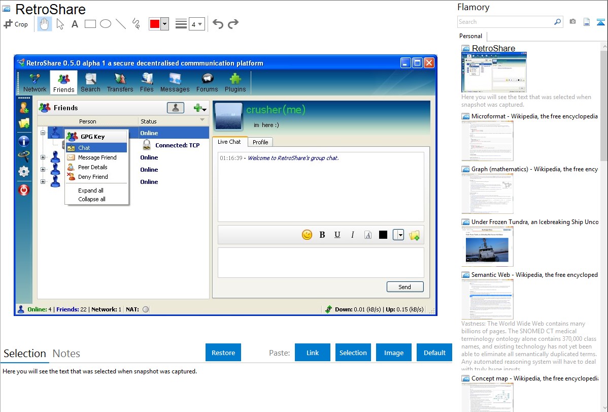Here is how RetroShare snapshot can look like. Get Flamory and try this on your computer.
