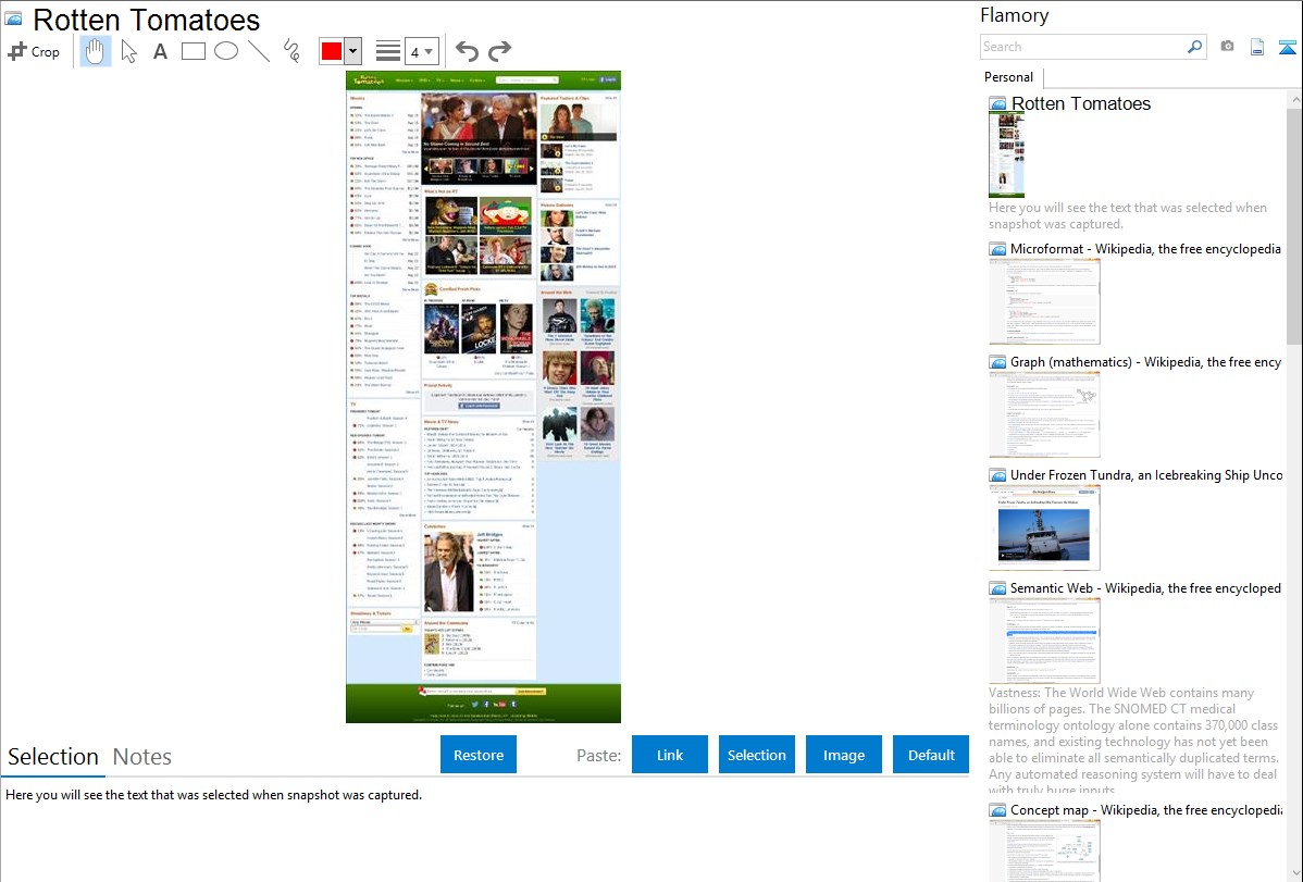 Flamory helps you capture and store screenshots from Rotten Tomatoes by pressing a single hotkey. It will be saved to a history, so you can continue doing your tasks without interruptions. Later, you can edit the screenshot: crop, resize, add labels and highlights. After that, you can paste the screenshot into any other document or e-mail message.