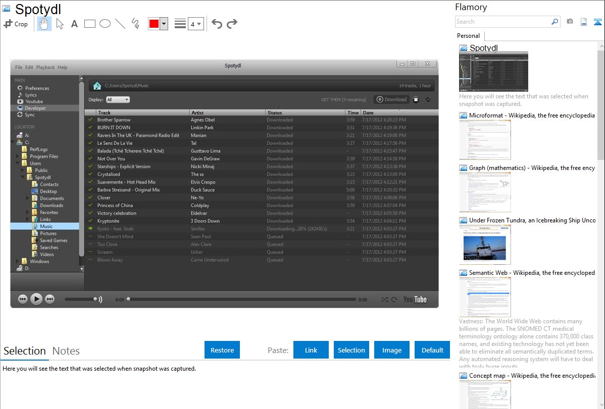 Flamory helps you capture and store screenshots from Spotydl by pressing a single hotkey. It will be saved to a history, so you can continue doing your tasks without interruptions. Later, you can edit the screenshot: crop, resize, add labels and highlights. After that, you can paste the screenshot into any other document or e-mail message.