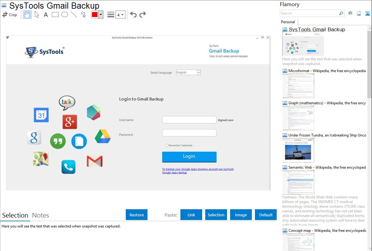 Flamory helps you capture and store screenshots from SysTools Gmail Backup by pressing a single hotkey. It will be saved to a history, so you can continue doing your tasks without interruptions. Later, you can edit the screenshot: crop, resize, add labels and highlights. After that, you can paste the screenshot into any other document or e-mail message.