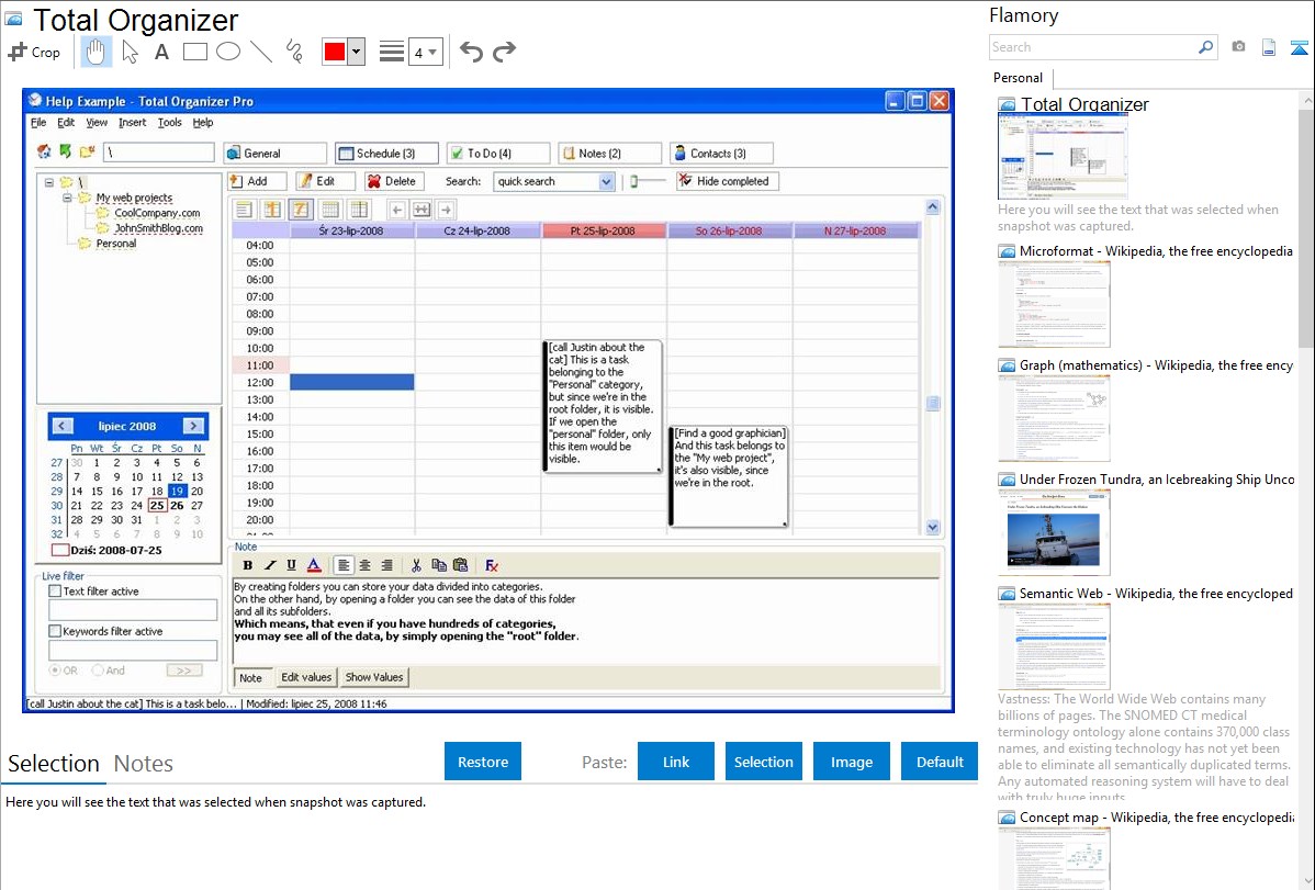 Flamory helps you capture and store screenshots from Total Organizer by pressing a single hotkey. It will be saved to a history, so you can continue doing your tasks without interruptions. Later, you can edit the screenshot: crop, resize, add labels and highlights. After that, you can paste the screenshot into any other document or e-mail message.