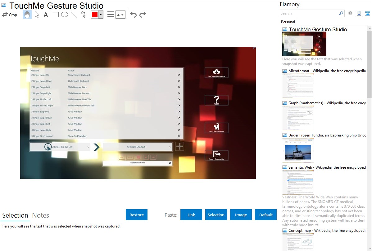Flamory helps you capture and store screenshots from TouchMe Gesture Studio by pressing a single hotkey. It will be saved to a history, so you can continue doing your tasks without interruptions. Later, you can edit the screenshot: crop, resize, add labels and highlights. After that, you can paste the screenshot into any other document or e-mail message.