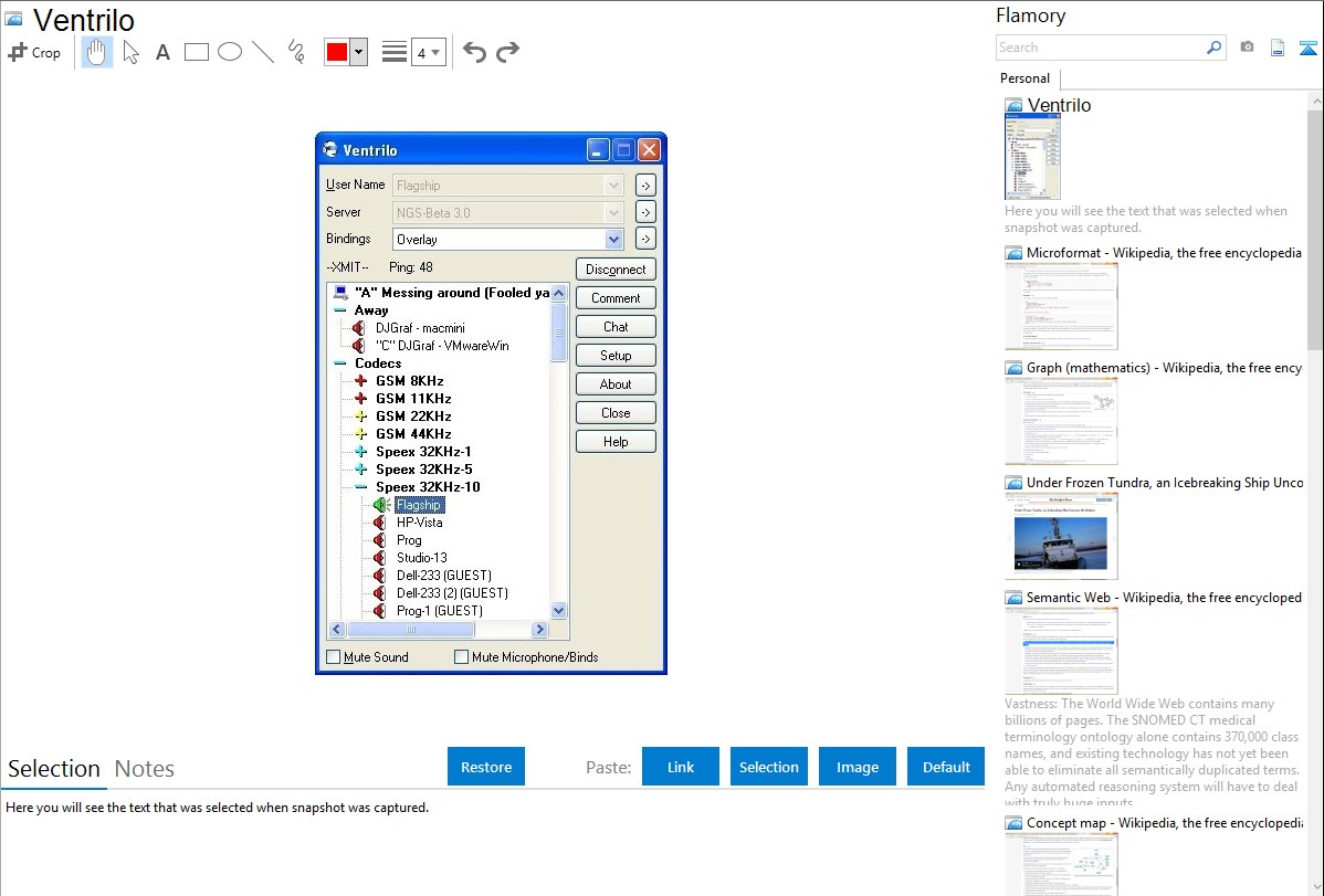 Flamory helps you capture and store screenshots from Ventrilo by pressing a single hotkey. It will be saved to a history, so you can continue doing your tasks without interruptions. Later, you can edit the screenshot: crop, resize, add labels and highlights. After that, you can paste the screenshot into any other document or e-mail message.
