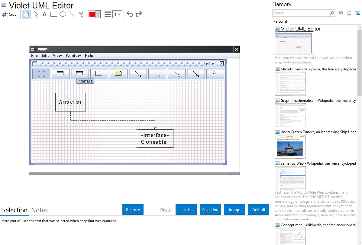 Flamory helps you capture and store screenshots from Violet UML Editor by pressing a single hotkey. It will be saved to a history, so you can continue doing your tasks without interruptions. Later, you can edit the screenshot: crop, resize, add labels and highlights. After that, you can paste the screenshot into any other document or e-mail message.