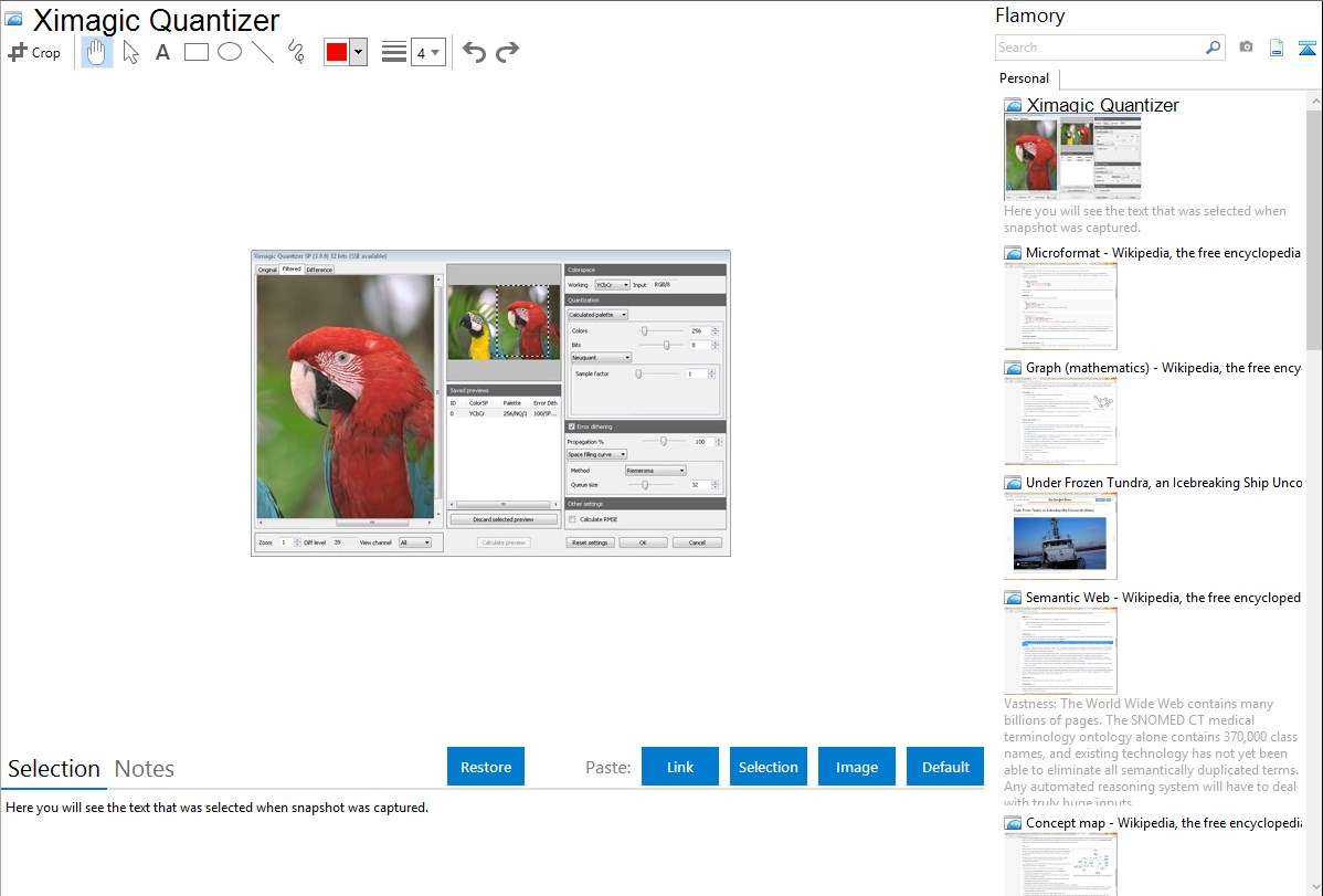 Flamory helps you capture and store screenshots from Ximagic Quantizer by pressing a single hotkey. It will be saved to a history, so you can continue doing your tasks without interruptions. Later, you can edit the screenshot: crop, resize, add labels and highlights. After that, you can paste the screenshot into any other document or e-mail message.